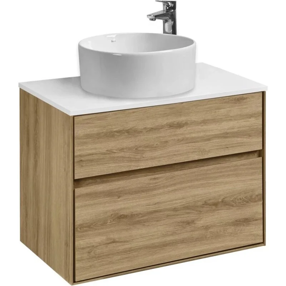 Тумба с раковиной Акватон Либерти 75 см, дуб эльвезия, раковина накладная Mila 40, столешница белая, 1A2795К2LY010