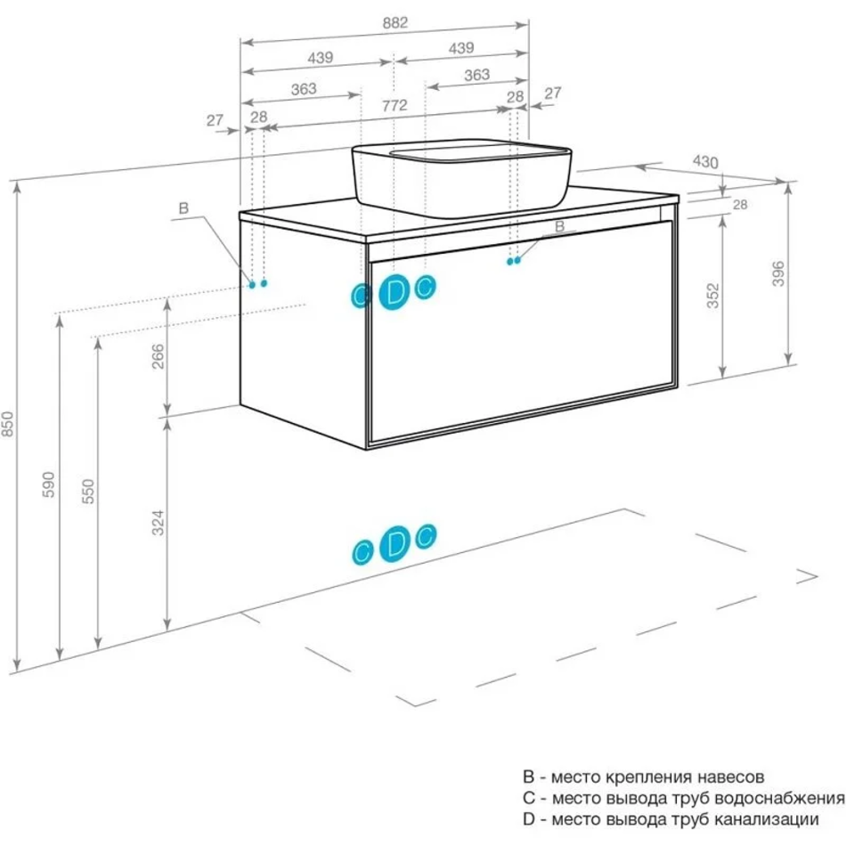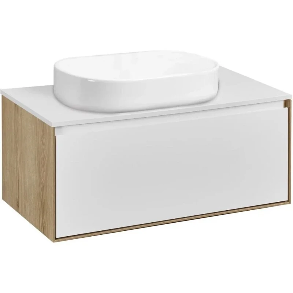 Тумба с раковиной Акватон Либерти 90 см, дуб эльвезия, белый, раковина накладная Лола 60, столешница белая, 1A2799К3LY010