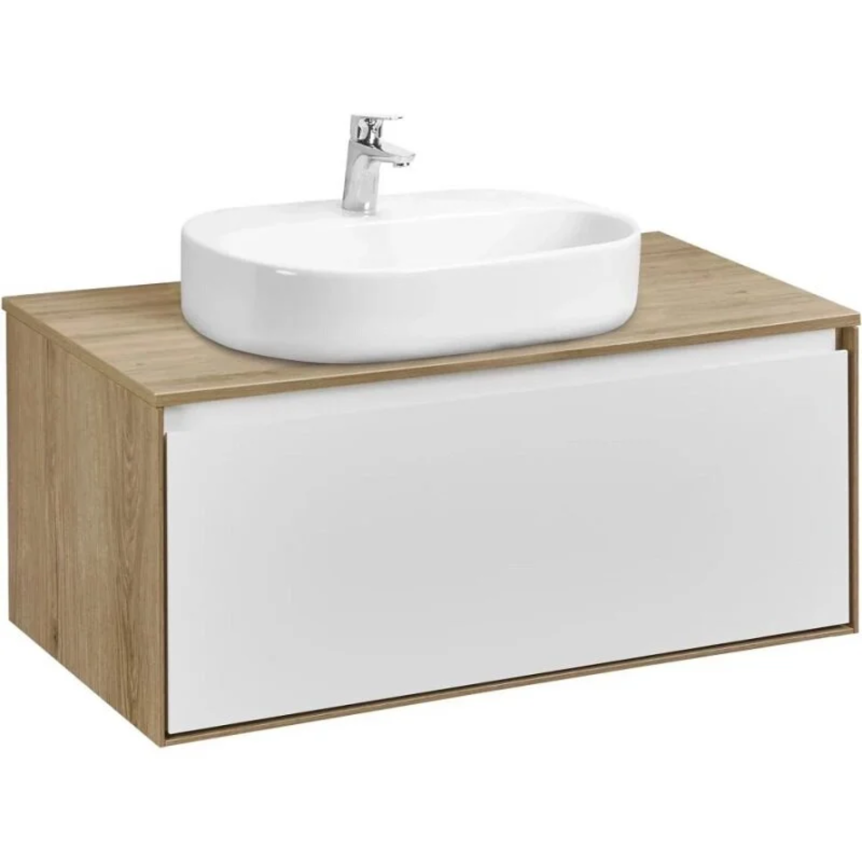 Тумба с раковиной Акватон Либерти 90 см, дуб эльвезия, белый, раковина накладная Одри Round 62 x 42, столешница дуб эльвезия, 1A2799К5LYC70