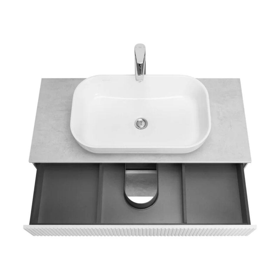 Верхний фасад выполнен из МДФ с реечной фрезеровкой в белой матовой пленке с эффектом soft touch, а нижний фасад из ламинированной влагостойкой ДСП Слэйт