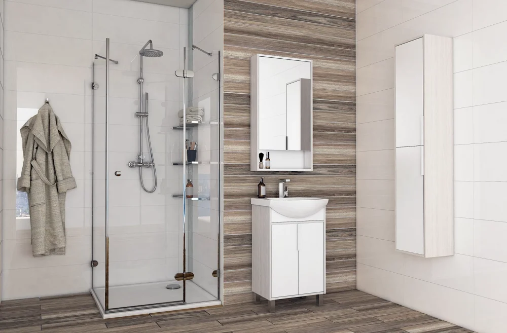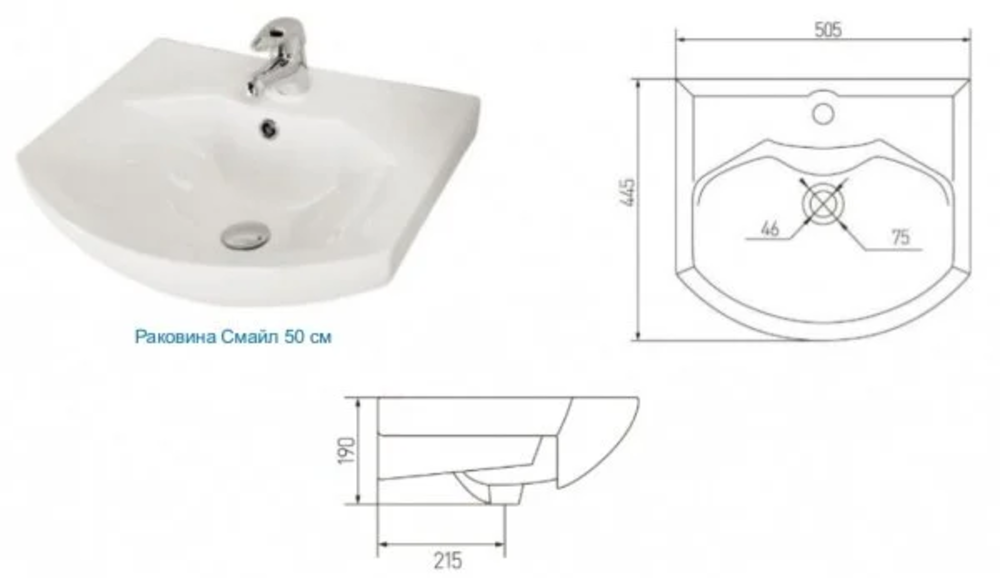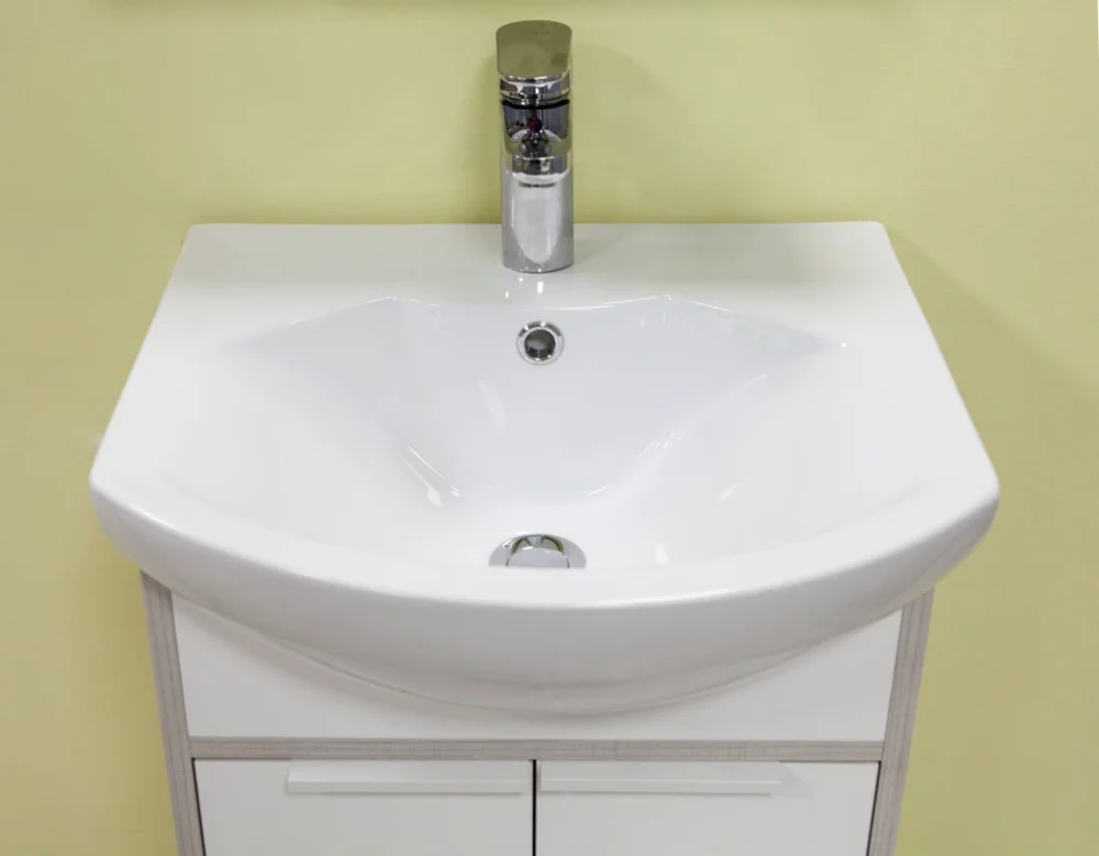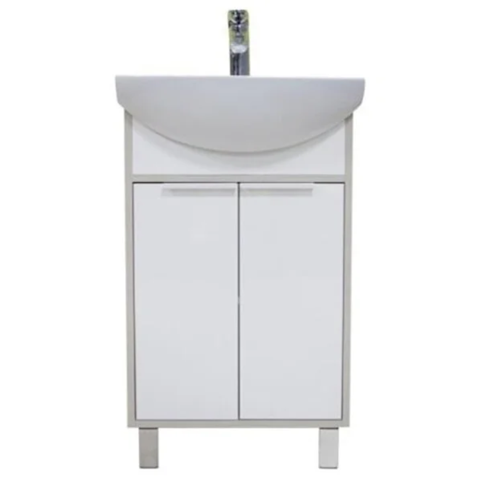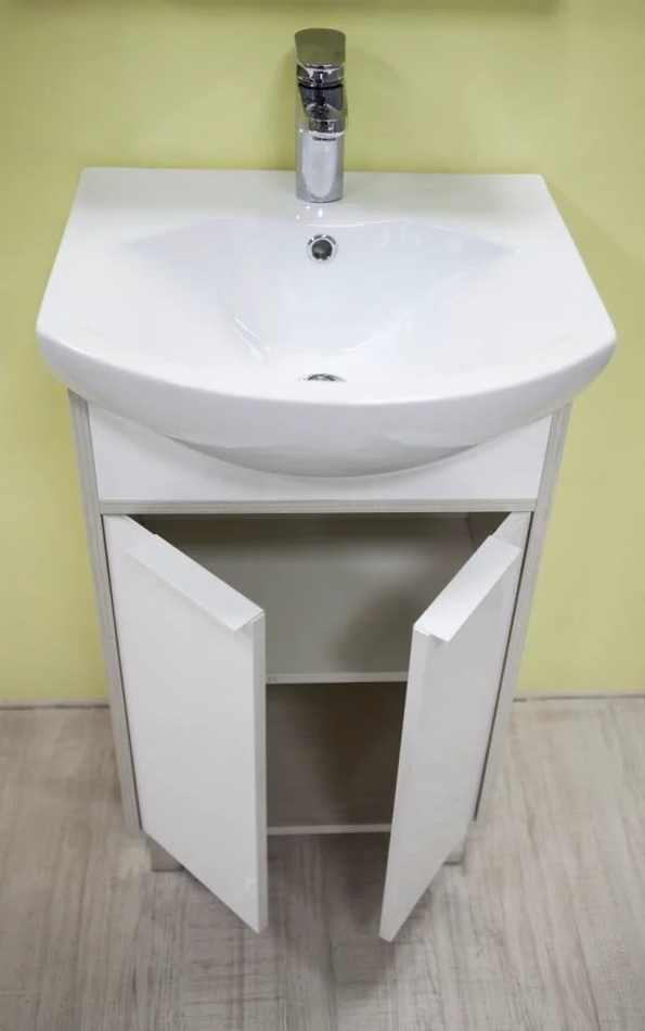 Тумба с раковиной Монтаж: напольный Размер: 46.6x30.9x72 см Доводчики Материал корпуса: влагостойкий ДСП Материал фасада: МДФ Форма: прямоугольная Раковина Смайл 50, керамика, белая Цвет: белый/ясень фабрик
