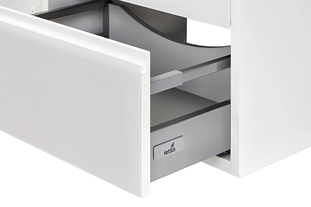 Тумба Римини 60 от Акватон отличается чёткой геометрией форм и создана для тех, кто ценит современный строгий и лаконичный дизайн, а также безупречное исполнение. Два металлических ящика тумбы снабжены направляющими полного выдвижения с системой мягкого закрывания. Минималистичный дизайн модели подчеркивает полное отсутствие лицевой фурнитуры. Корпус, изготовленный из влагостойкой ЛДСП, и фасады из МДФ, окрашены в белый цвет полиэфирной краской ультрафиолетового отверждения с высокой степенью глянца.