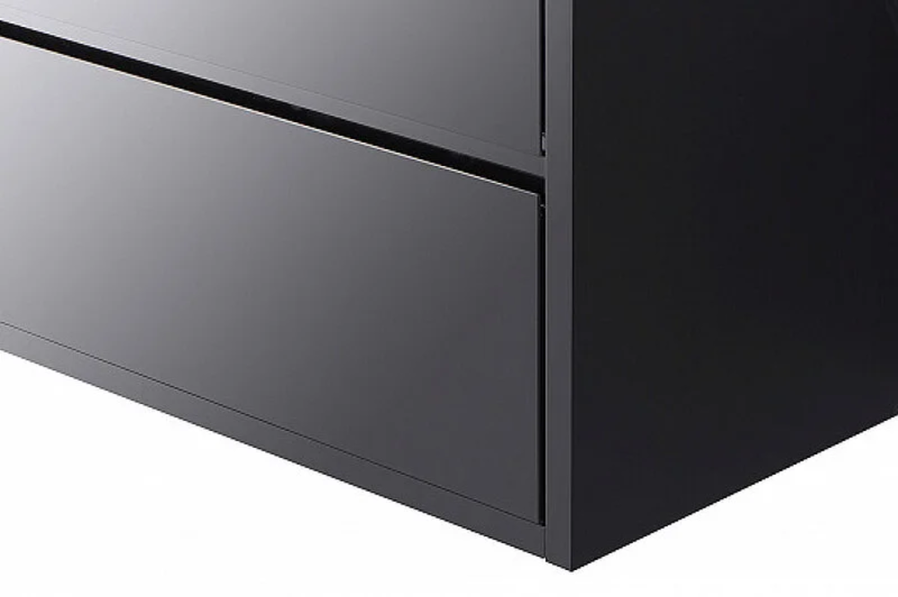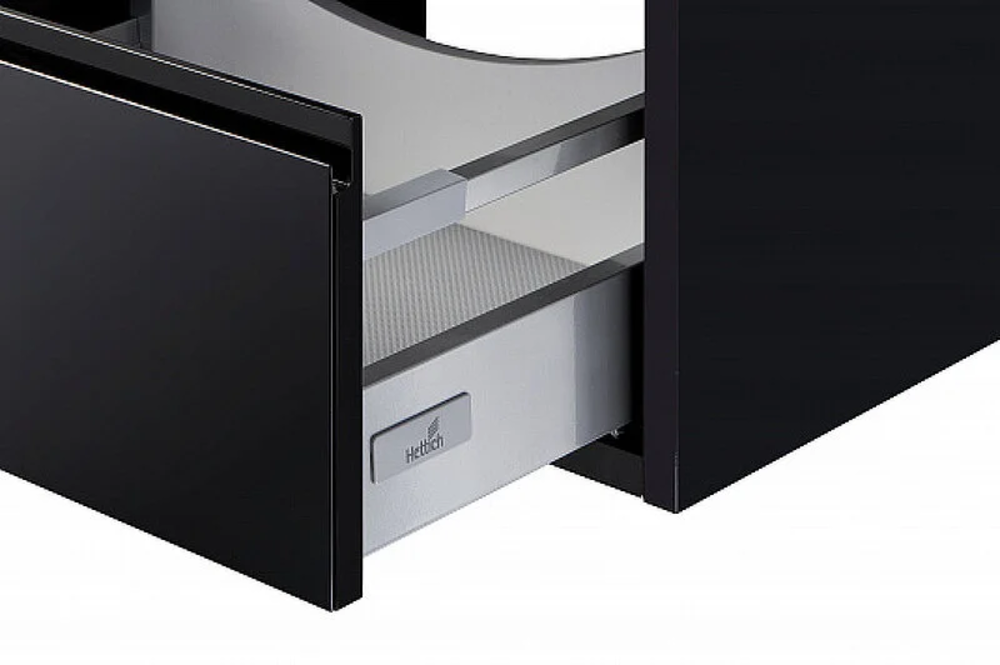 Тумба Римини 60 от Акватон отличается чёткой геометрией форм и создана для тех, кто ценит современный строгий и лаконичный дизайн, а также безупречное исполнение. Два металлических ящика тумбы снабжены направляющими полного выдвижения с системой мягкого закрывания. Минималистичный дизайн модели подчеркивает полное отсутствие лицевой фурнитуры. Корпус, изготовленный из влагостойкой ЛДСП, и фасады из МДФ, окрашены в чёрный цвет полиэфирной краской ультрафиолетового отверждения с высокой степенью глянца. Дополнит комплект прямоугольная раковина Victoria-N Unik 60х46 испанского производителя Roca.