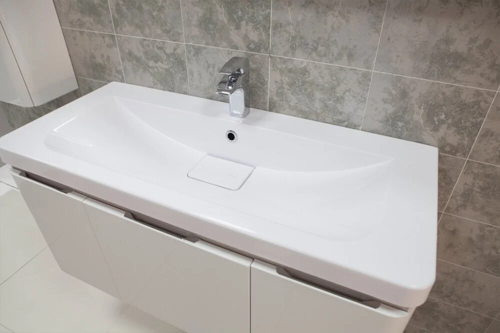 Тумба с раковиной Монтаж: подвесной Размер: 84.4x45.7x44 см Доводчики Материал корпуса: влагостойкий ДСП Материал фасада: МДФ Форма: прямоугольная Раковина Шерилл 105, керамика, белая Цвет: белый