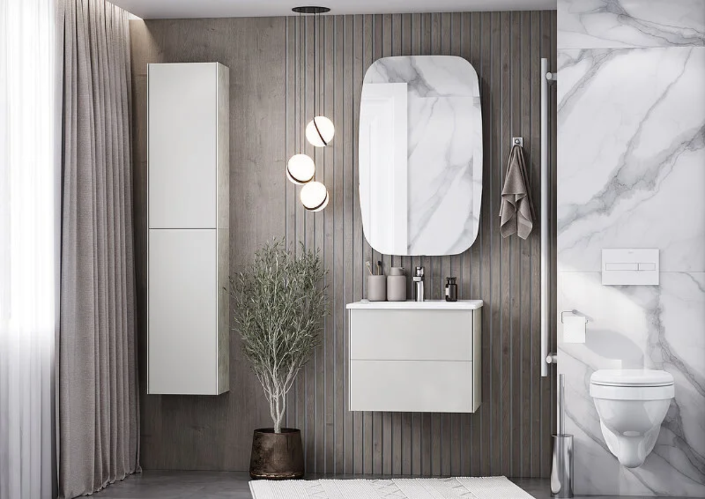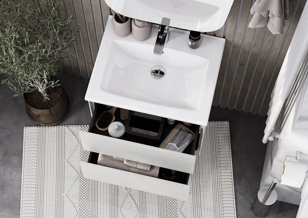 Тумба Сохо 60 функционально состоит из двух вместительных ящиков, оснащенных системой push to open, обеспечивающей надежное, комфортное и бесшумное закрывание. Фасады изделия выполнены из МДФ в пленке в цвете галька серая, корпус из ламинированной влагостойкой ДСП слэйт. Верхний и нижний ящики оснащены системой организации пространства, которая позволяет содержать косметические средства в идеальном порядке. Дополняет тумбу стильная раковина Элина от бренда Santek с удобной чашей. Все внутренние детали тумбы выполнены в цвете антрацит.