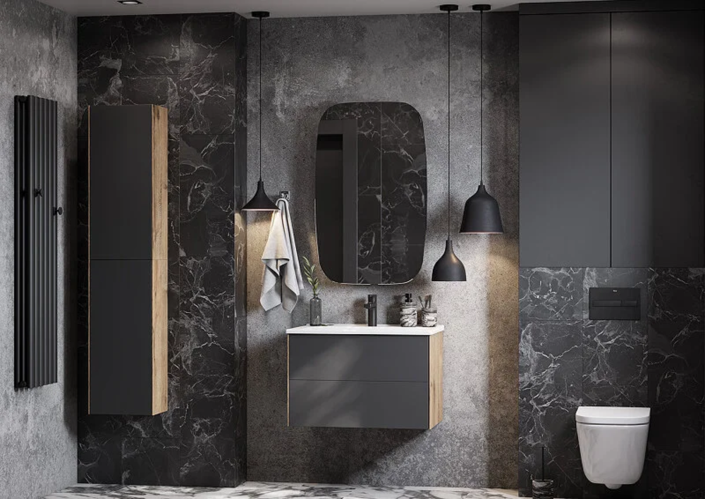 Тумба Сохо 75 функционально состоит из двух вместительных ящиков, оснащенных системой push to open, обеспечивающей надежное, комфортное и бесшумное закрывание. Фасады изделия – МДФ в пленке графит с эффектом soft touch, корпус – ламинированная влагостойкая ДСП Дуб веллингтон. Верхний и нижний ящики оснащены системой организации пространства, которая позволяет содержать косметические средства в идеальном порядке. Дополняет тумбу стильная раковина Элина от бренда Santek с удобной чашей. Все внутренние детали тумбы выполнены в тон фасадов – цвета антрацит.