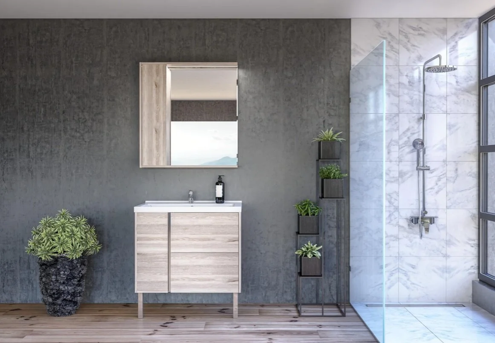 Тумба с раковиной Раковина Миранда 80 Монтаж: подвесной Размер: 76 x 44.2 x 60 см Ящики выдвижные: 2 С системой плавного закрывания Покрытие: краска Материал: ЛДСП, МДФ Форма: прямоугольная Цвет: сосна арлингтон