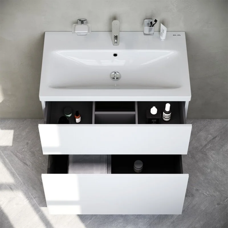 Напольная тумба бренда AM.PM коллекции Gem изготовлена из влагостойкого ЛДСП. Внутреннее пространство двух вместительных ящиков представлено в цвете "антрацит" с антискользящим эффектом. В верхнем ящике находится удобный органайзер для хранения гигиенических принадлежностей. Благодаря системе отделений органайзера, каждый предмет имеет свое место, что обеспечивает порядок и удобство при использовании. Такая система хранения позволяет экономить место и помогает поддерживать чистоту ванной комнаты. Фурнитура push-to-open - открытие ящика легким нажатием на фасад. Направляющие скрытого монтажа обеспечивают плавное выдвижение ящиков. Материал изделия - влагостойкая ЛДСП. Покрытие фасада и корпуса - ламинат. Размер тумбы (Ш/Г/В): 750x408x810 мм. Цвет тумбы – белый глянец. Тумба дополнена раковиной коллекции Gem белоснежного цвета, изготовленной из стекловидного фарфора. Размер раковины (Ш/Г/В): 760x425x170 мм. Цвет раковины - белый.