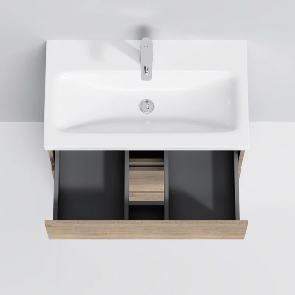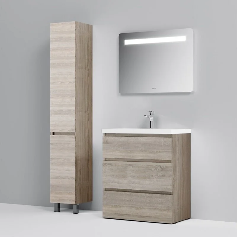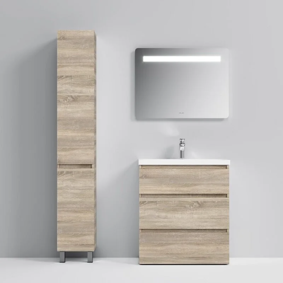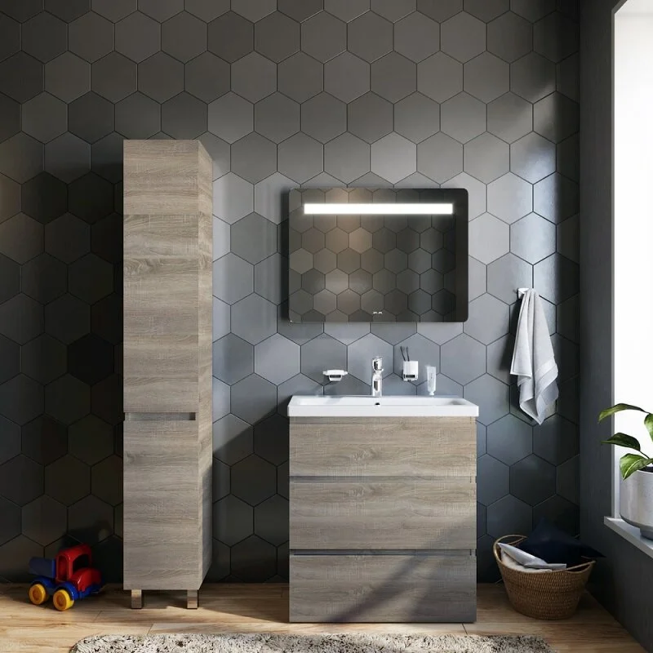 Напольная тумба бренда AM.PM коллекции Gem S представлена в современном дизайне от европейской студии DanelonMeroni (Великобритания/Италия). Покрытие корпуса и фасада - ламинат. Уникальный нижний ящик базы может быть использован как: выдвижная подставка для детей, для удобного мытья рук (выдерживает нагрузку до 60 кг), дополнительная ниша для хранения (экономия пространства ванной комнаты). Ящики с внутренним антискользящим покрытием цвета "антрацит" – европейский стандарт. Материал изделия - влагостойкая ЛДСП. Размер тумбы (Ш/Г/В): 750x425x810 мм. Цвет тумбы – светлый дуб. Тумба дополнена раковиной коллекции Gem белоснежного цвета, изготовленной из стекловидного фарфора. Размер раковины (Ш/Г/В): 760x425x170 мм. Цвет раковины - белый.
