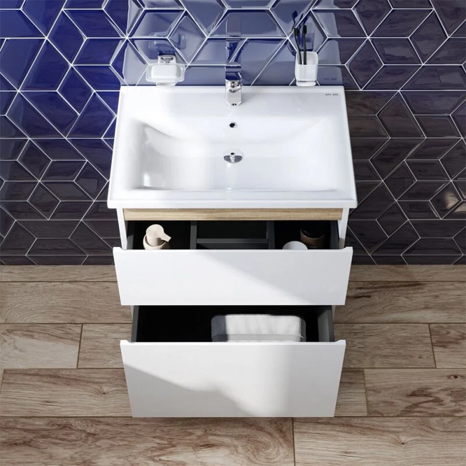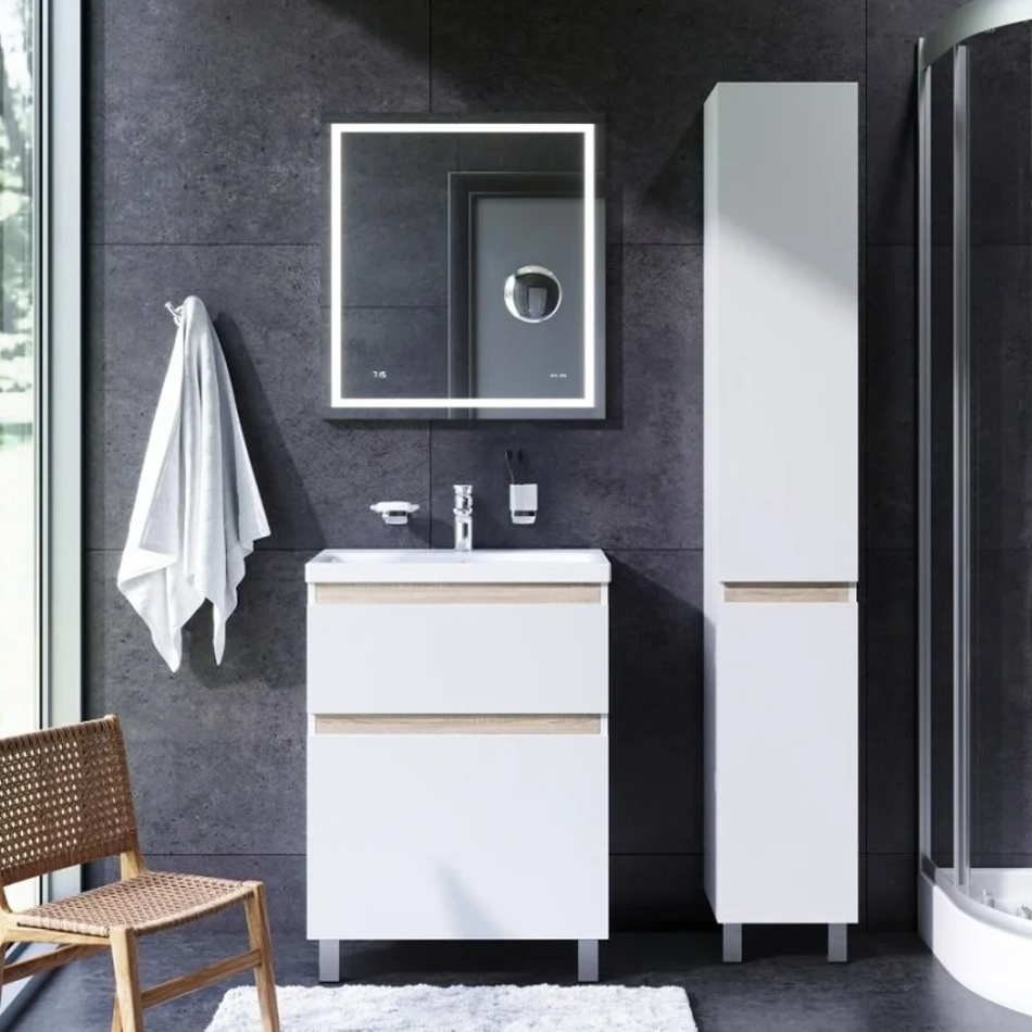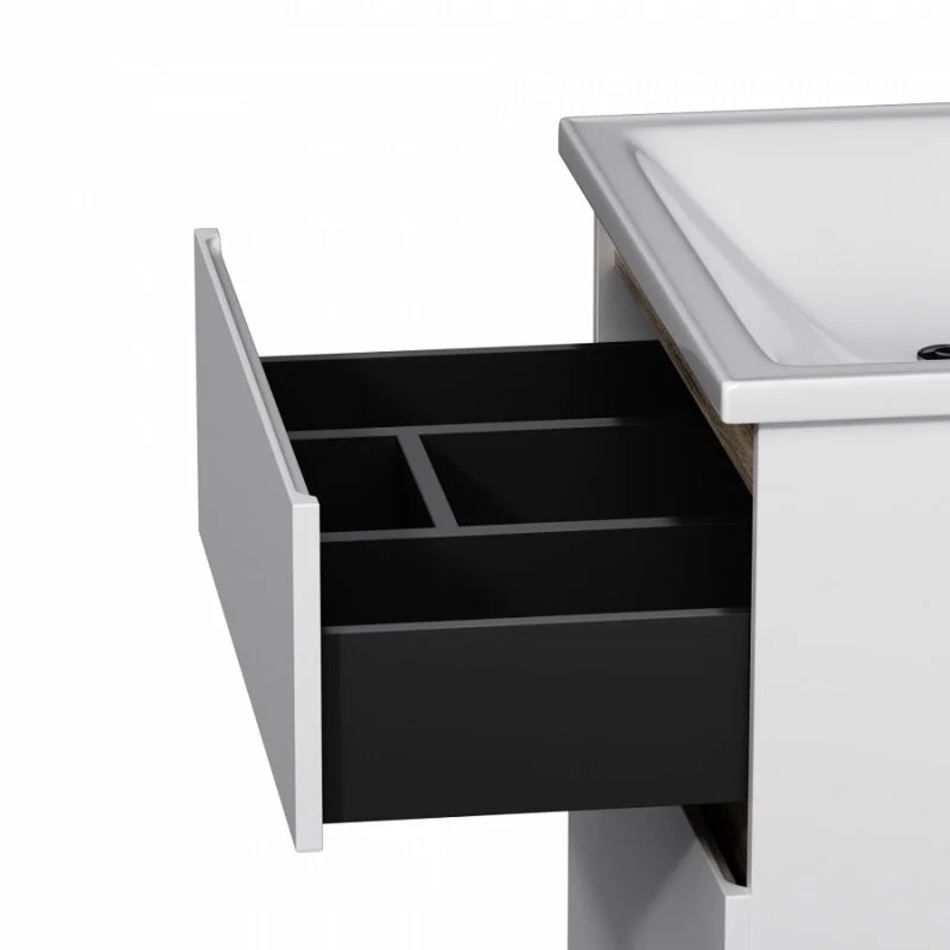 Впервые на рынке – дизайнерская коллекция сантехники которую может позволит себе каждый. Самое эстетичное сочетание цветов и фактур от дизайн-бюро Danelon Meroni (Великобритания & Италия): белые глянцевые фасады дополнены отделкой под светлое дерево. Функциональный органайзер в первом ящике позволит хранить необходимые косметические средства под рукой и в полном порядке. Внутреннее покрытие каждого ящика выполнено в современном цвете Anthracite и имеет противоскользящее покрытие. Встроенная керамическая раковина белоснежного цвета оснащена специальным бортиком для защиты от пролива воды за мебель.Экологически чистые и удивительно долговечные полиакриловые эмали – специальная технология покраски в 7 слоев превосходит технологию нанесения автоэмали у ведущих немецких марок и обеспечивает насыщенный цвет в течение всего срока службы (от 10 лет). Боковины базы выполнены из влагостойкой ЛДСП что позволяет продлевать срок службы мебели до максимального в индустрии.