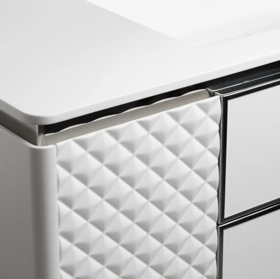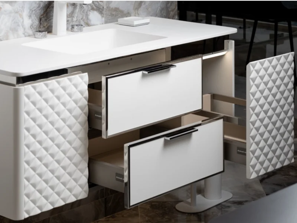 Уникальная и в тоже время неординарная разработка итальянских мастеров воплотилась в коллекции Rombo от компании Armadi Art. Под основанием тумбы встроенная LED-подсветка придаёт парящий вид. Выдвижные боковые ящики имеют ромбовидную форму и снабжены премиальной немецкой фурнитурой с плавным ходом Hettich. Окантовка как и ручки центральных ящиков бывают в двух вариантов в золотом и хромированном цветах. Внутренние ящики отделаны качественной экокожей. Встроенная автоматическая подсветка внутри тумбы придаёт дополнительный эффект нереального. Мебель покрыта матовой эмалью в 7 слоёв.