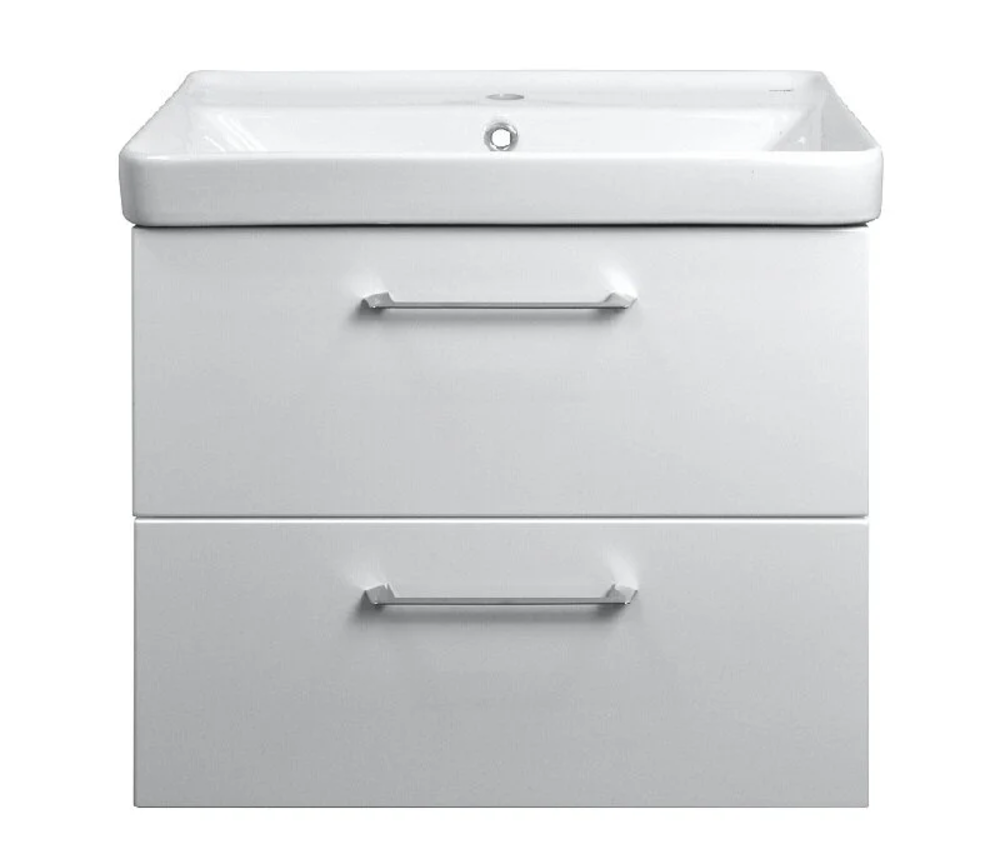Тумба с 2 выдвижными ящиками. Тумба комплектуется направляющими скрытого монтажа с доводчиками Hettich. Внутренние ящики серого цвета. Бока тумбы изготовлены из ВЛДСП, фасад – МДФ. Бока тумбы и фасад крашеные (глянец). Комплектуется умывальником.