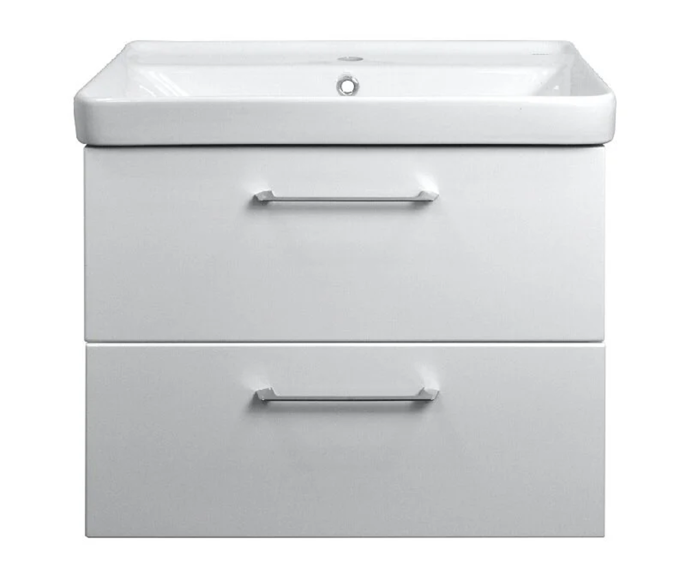 Тумба с 2 выдвижными ящиками. Тумба комплектуется направляющими скрытого монтажа с доводчиками Hettich. Внутренние ящики серого цвета. Бока тумбы изготовлены из ВЛДСП, фасад – МДФ. Бока тумбы и фасад крашеные ( глянец). Комплектуется умывальником.