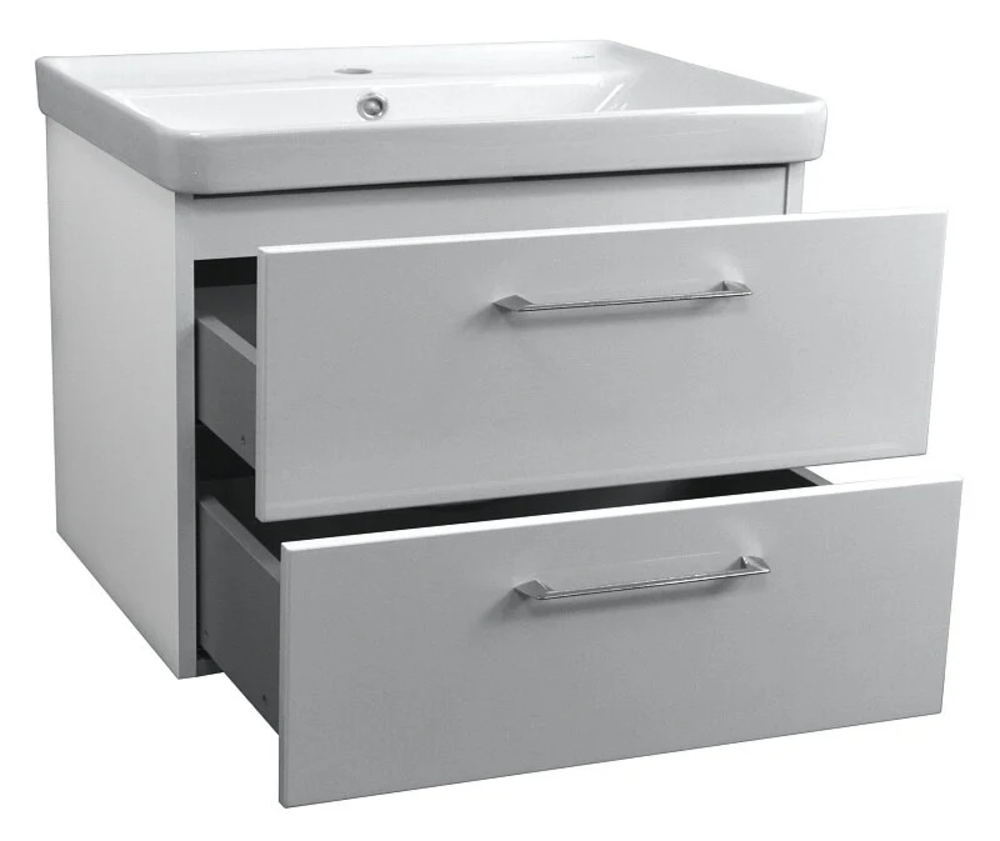 Тумба с 2 выдвижными ящиками. Тумба комплектуется направляющими скрытого монтажа с доводчиками Hettich. Внутренние ящики серого цвета. Бока тумбы изготовлены из ВЛДСП, фасад – МДФ. Бока тумбы и фасад крашеные ( глянец). Комплектуется умывальником.