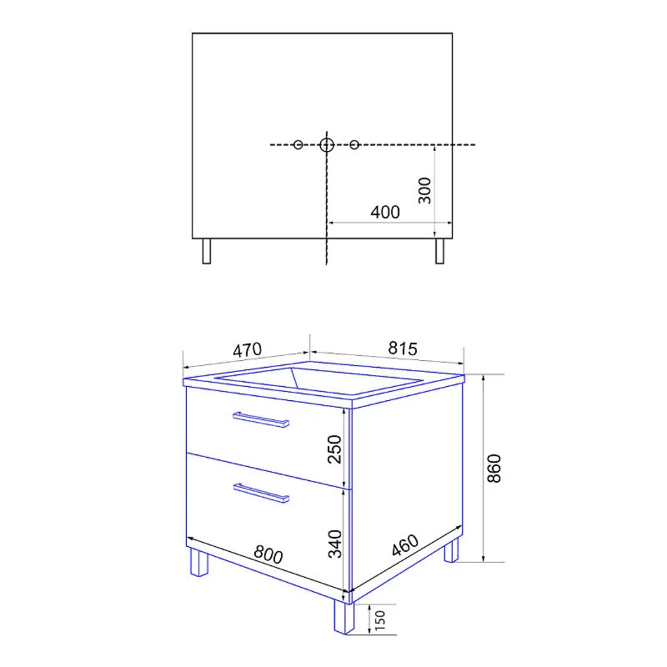 Тумба с 2 выдвижными ящиками. Тумба комплектуется направляющими скрытого монтажа с доводчиками Hettich. Внутренние ящики серого цвета. Бока тумбы изготовлены из ВЛДСП, фасад – МДФ. Бока тумбы и фасад крашеные (глянец). Комплектуется умывальником.