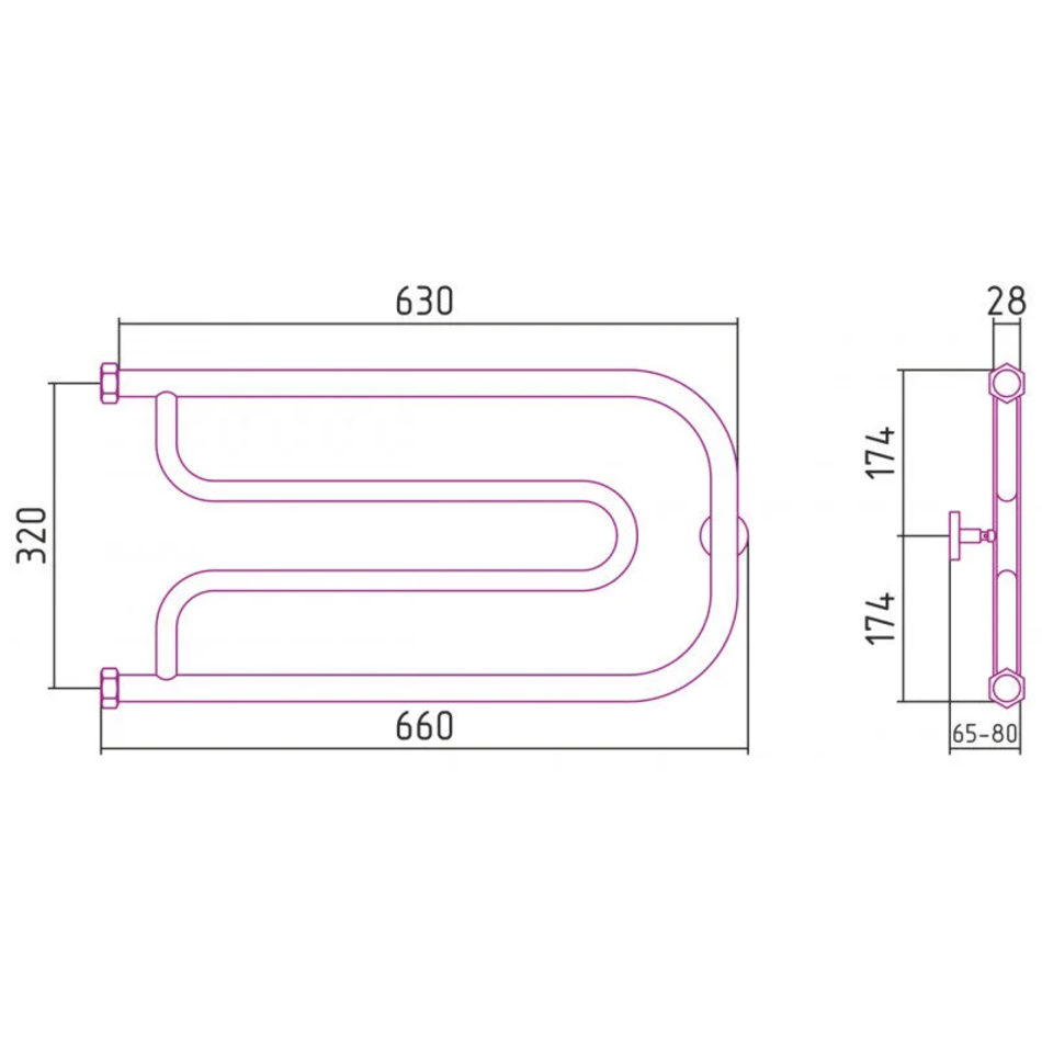 Полотенцесушитель водяной Сунержа Гусли+ 15-4009-3265, ширина 65 см, высота 32 см, боковое подключение 32 см, цвет тёмный титан муар
