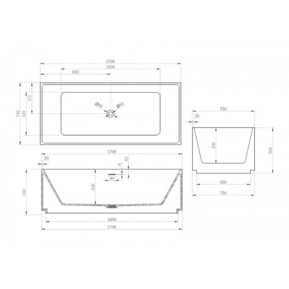 Ванна Abber Stein из искусственного камня 170 х 75 см, белая матовая, AS9602