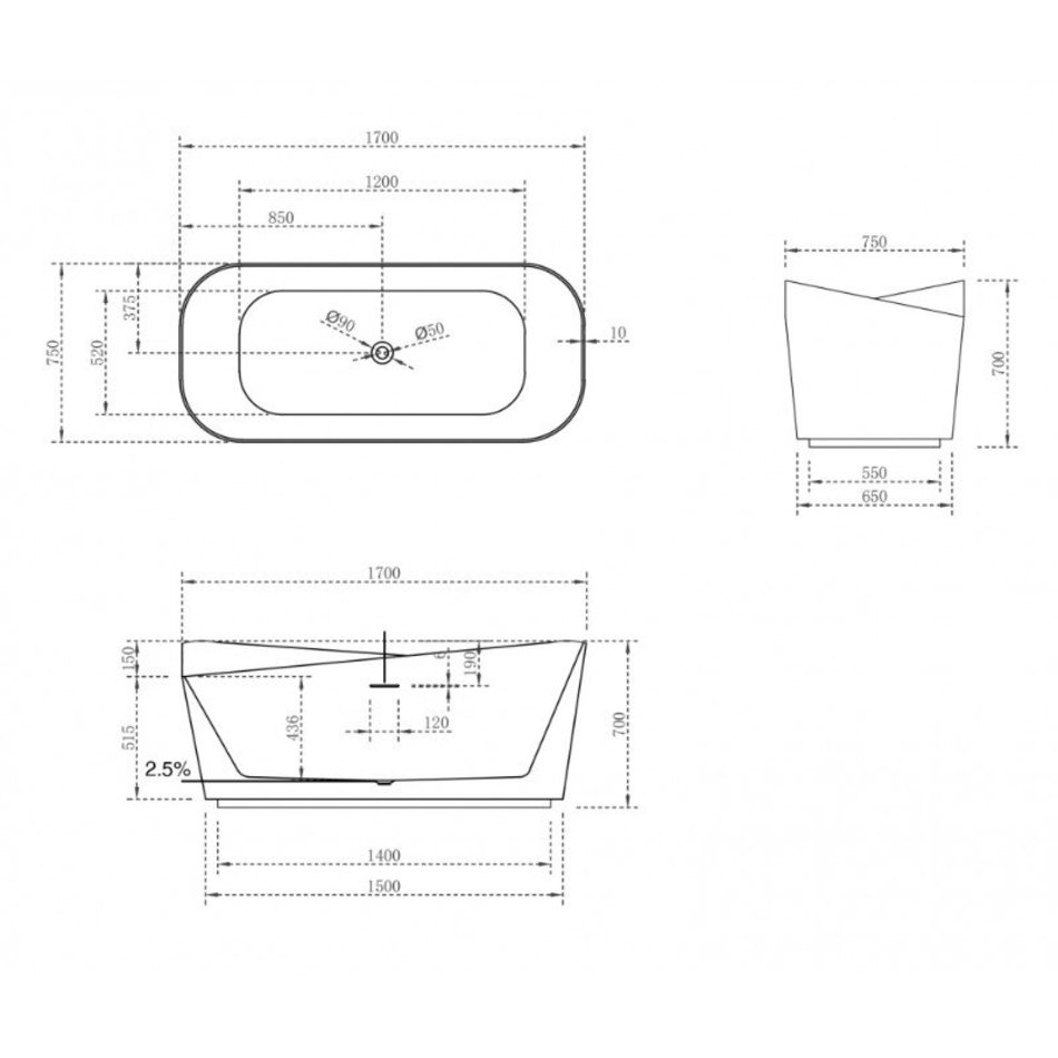 Ванна Abber Stein из искусственного камня 170 х 75 см, белая матовая, AS9609
