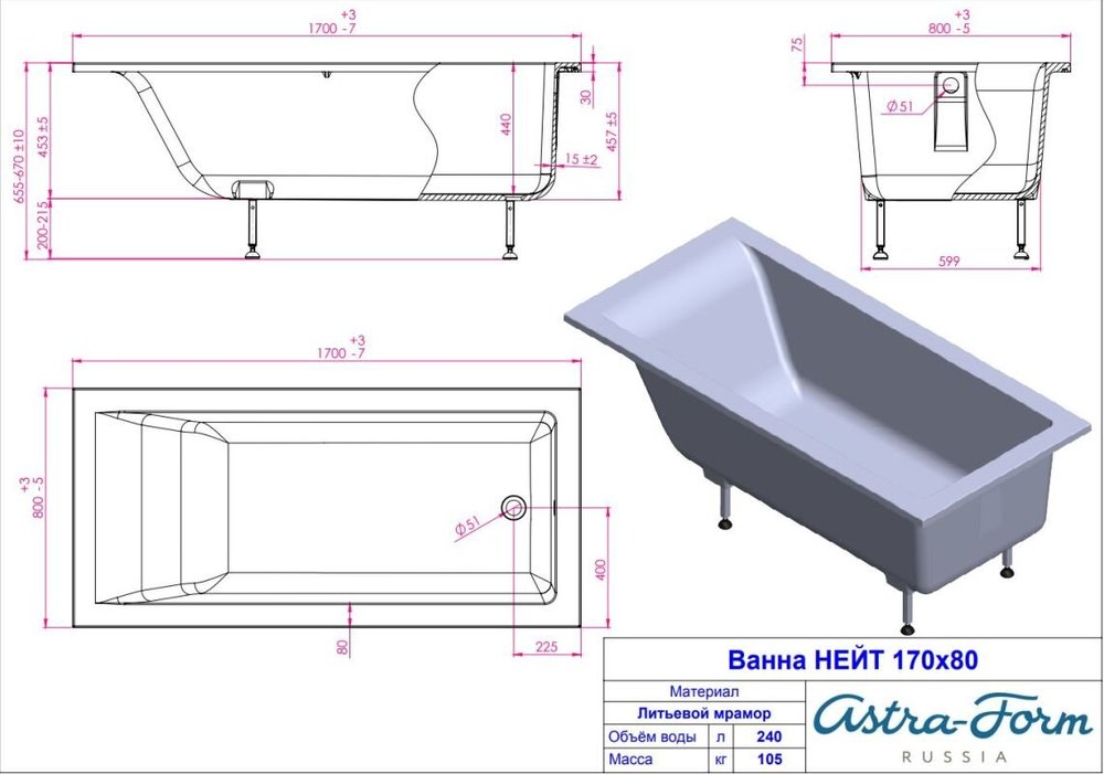 Ванна из литьевого мрамора Astra-Form Нейт 170 х 80 см, белый