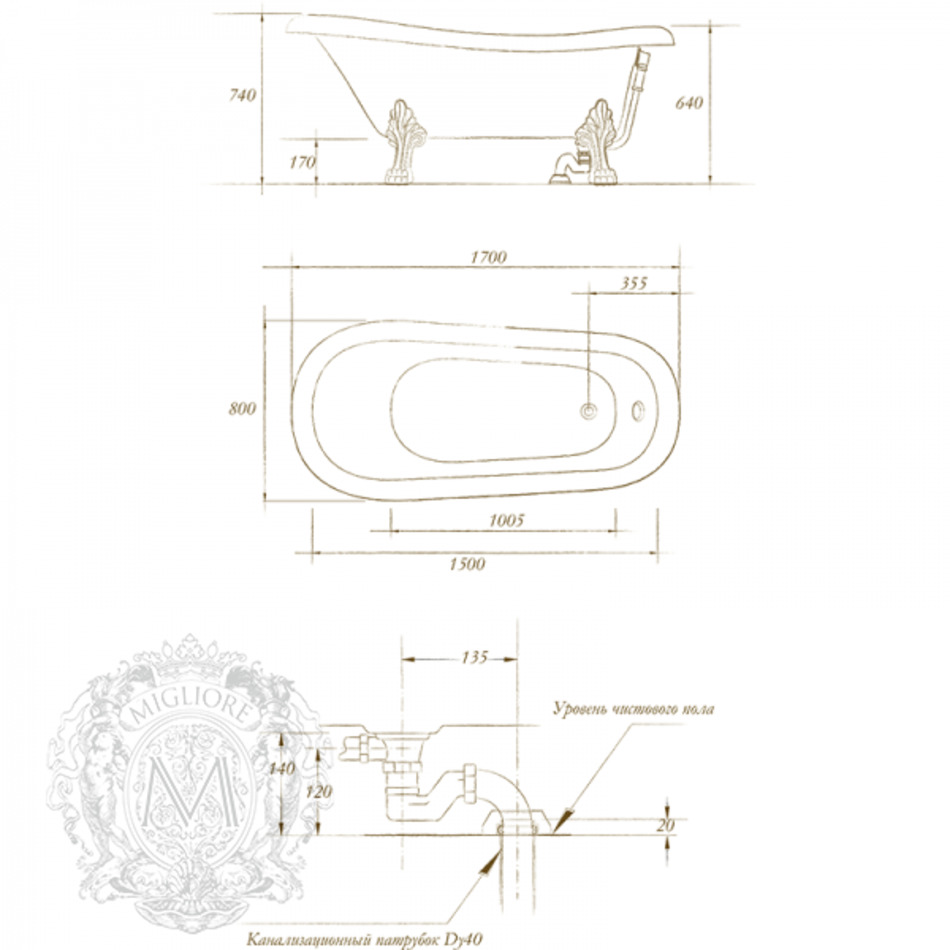 Ванна из литьевого мрамора Migliore Bella 26916, 170 х 80 см, фурнитура бронза