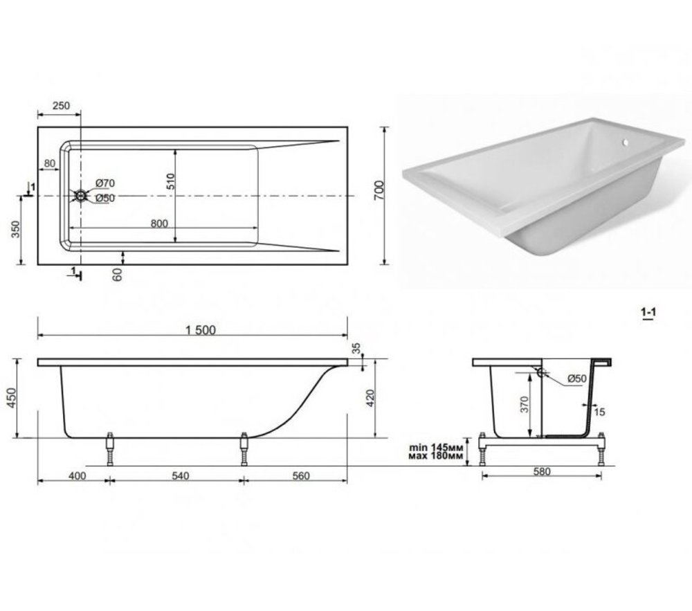 Ванна из литьевого мрамора Эстет Дельта 150 х 70 см, белая, ФР-00001470