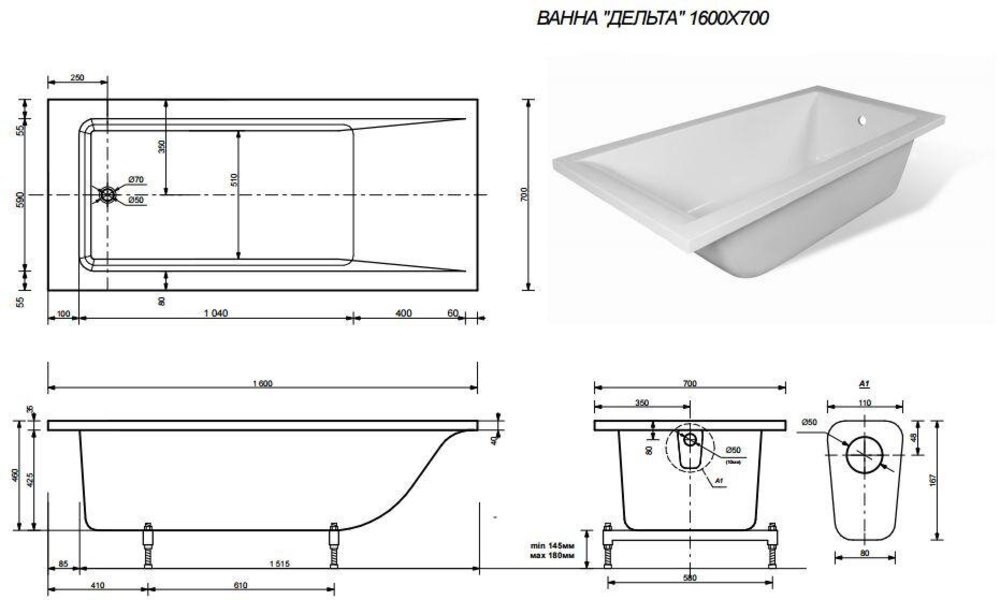 Ванна из литьевого мрамора Эстет Дельта 160А, 160 х 70 см