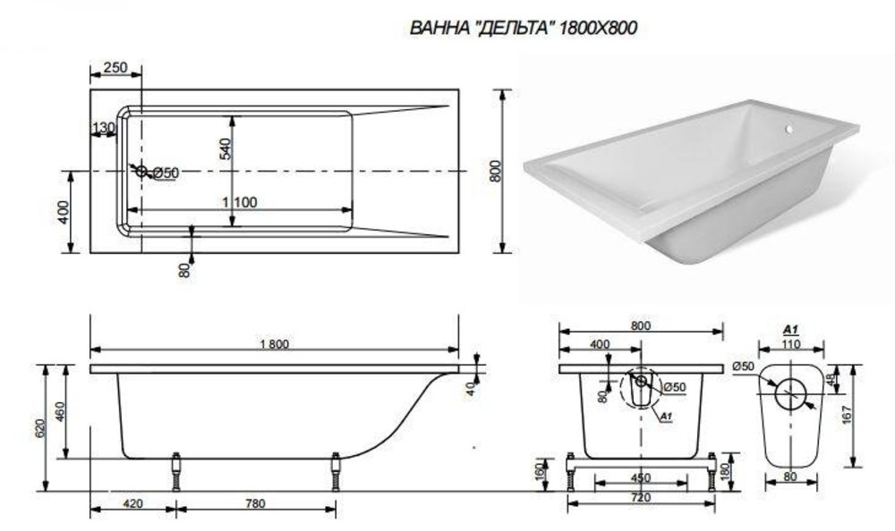 Ванна из литьевого мрамора Эстет Дельта, 180 х 80 см