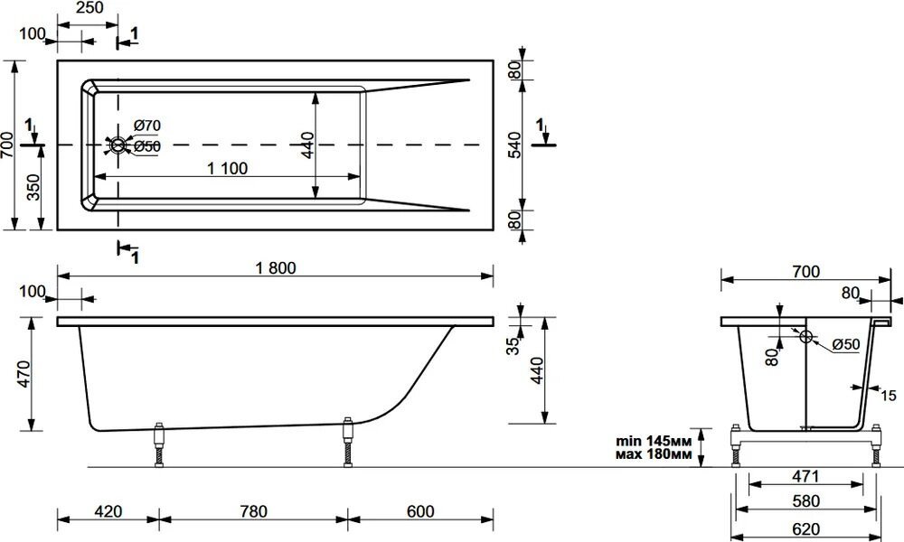 Ванна из литьевого мрамора Эстет Дельта 180А 180 х 70 см, прямоугольная, белая, ФР-00010113