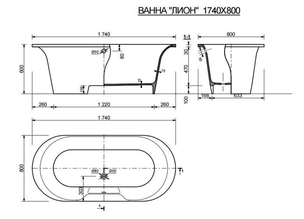 Ванна из литьевого мрамора Эстет Лион, 174 х 80 см