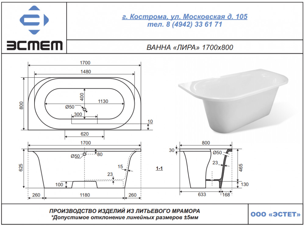 Ванна из литьевого мрамора Эстет Лира 170 х 80 см
