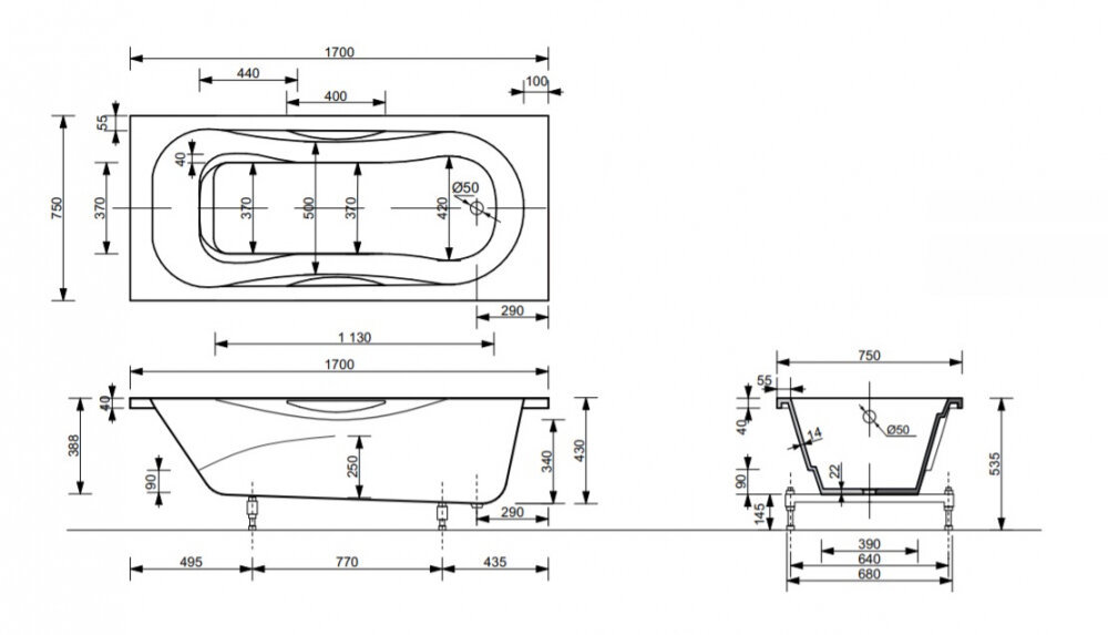 Ванна из литьевого мрамора Эстет Эллис 170 x 75 см, ФР-00008586, белый