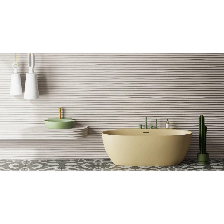 Более тонкая, детальная проработка формы чаши позволила уйти от классического понимания пристенной ванны с массивной боковой проекцией: блок, соприкасающийся со стеной, будто утоплен вдоль задней поверхности. Такова новая эстетика облегчённого дизайнерского решения Salini.