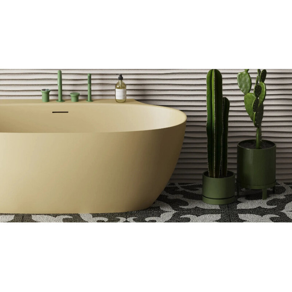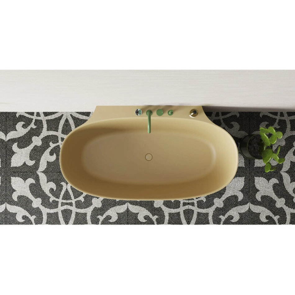 Эта модель соединяет в себе классическую овальную форму изголовий и спрятанный за ними пристенный борт. Благодаря такой конструкции создаётся впечатление отдельностоящей ванны, но сохраняется практичность плотного примыкания к стене и дополнительной поверхности для хранения косметических средств и аксессуаров. При желании здесь также можно разместить и смеситель.