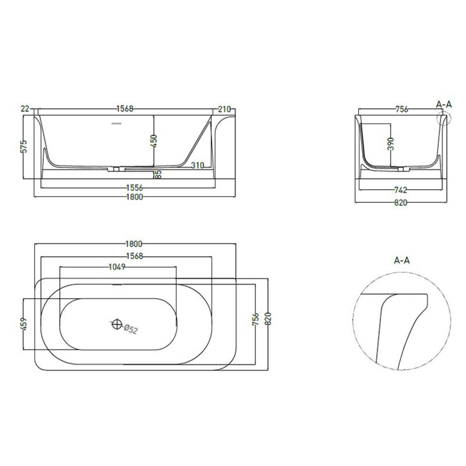 Ванна Salini Ninfea 180 x 82 х 57,5 см, из искусственного камня S-Stone, белый матовый, покраска по RAL снаружи, 102721MRH