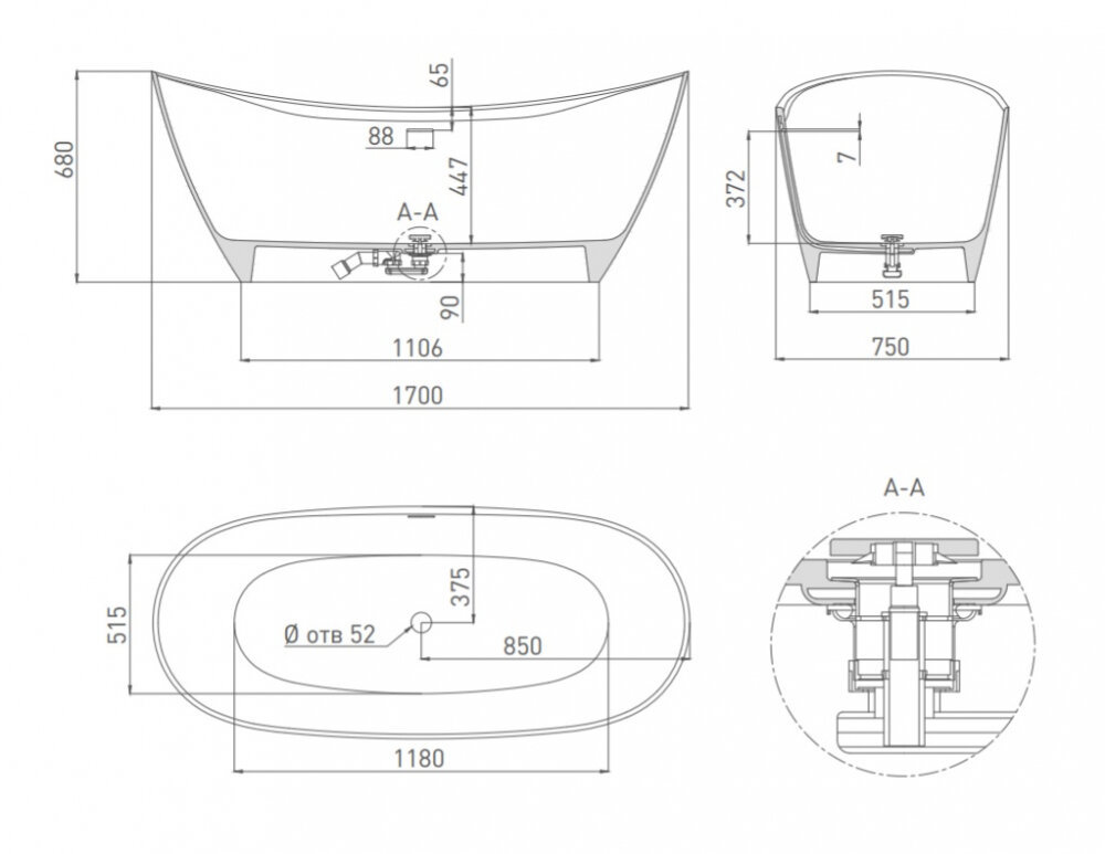 Ванна Salini Noemi 170 х 75 х 68 см, из искусственного камня S-Sense, белый глянцевый,101712G