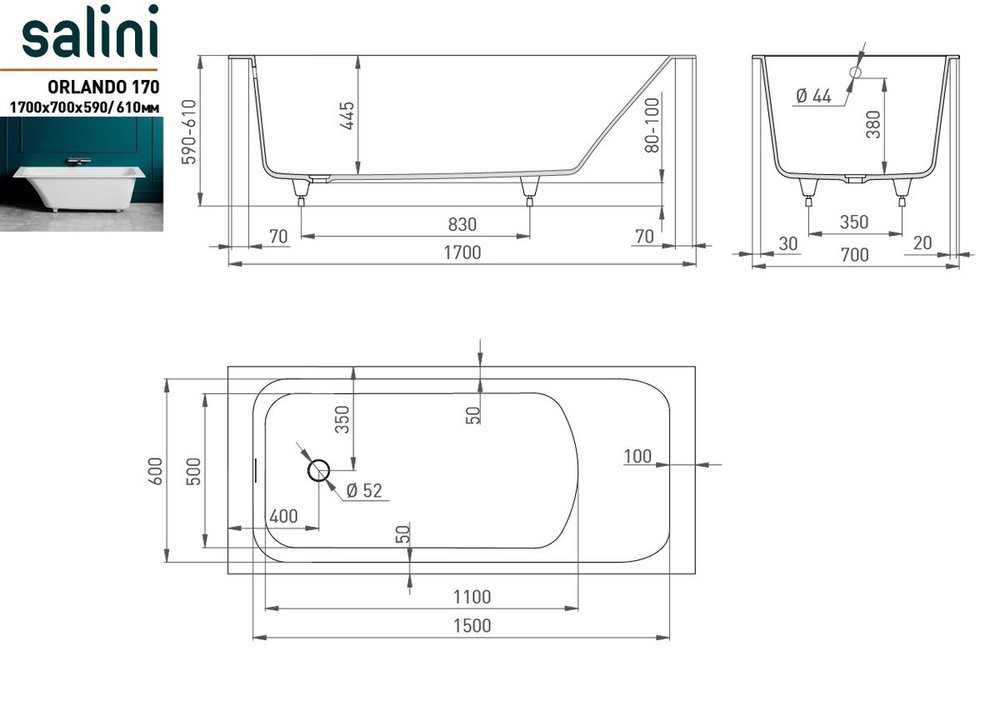 Ванна Salini Orlando 102011G/M, 170 х 70 см, из материала Sapirit, глянцевая или матовая белая