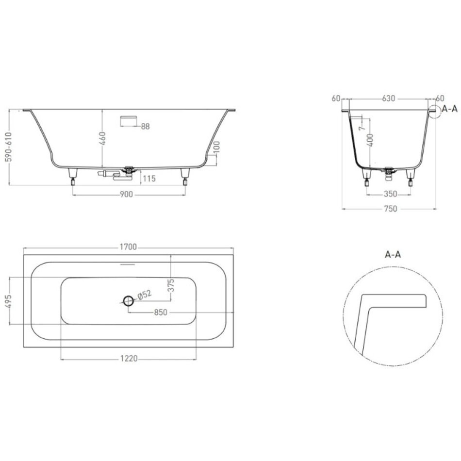 Ванна Salini Orlanda Axis Kit 103313GRH, 170 х 75 см, из искусственного камня S-Sense, белый глянцевый, покраска внутренней поверхности RAL