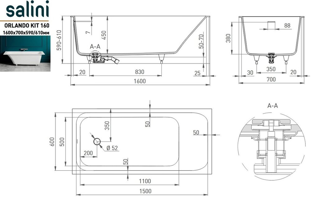 Ванна Salini Orlando Kit 160 х 70 х 60 см, из искусственного камня S-Sense, белый глянцевый, 102115G