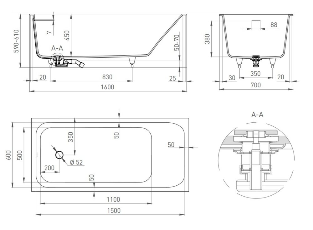 Ванна Salini Orlanda Kit 160 х 70 х 60 см, из искусственного камня S-Sense, белый матовый, 102115M