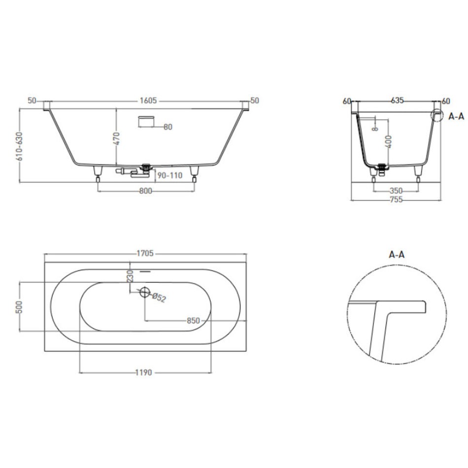 - Оснащение регулируемые ножки, донный клапан “Click-Clack”, сифон, интегрированный слив-перелив по центу