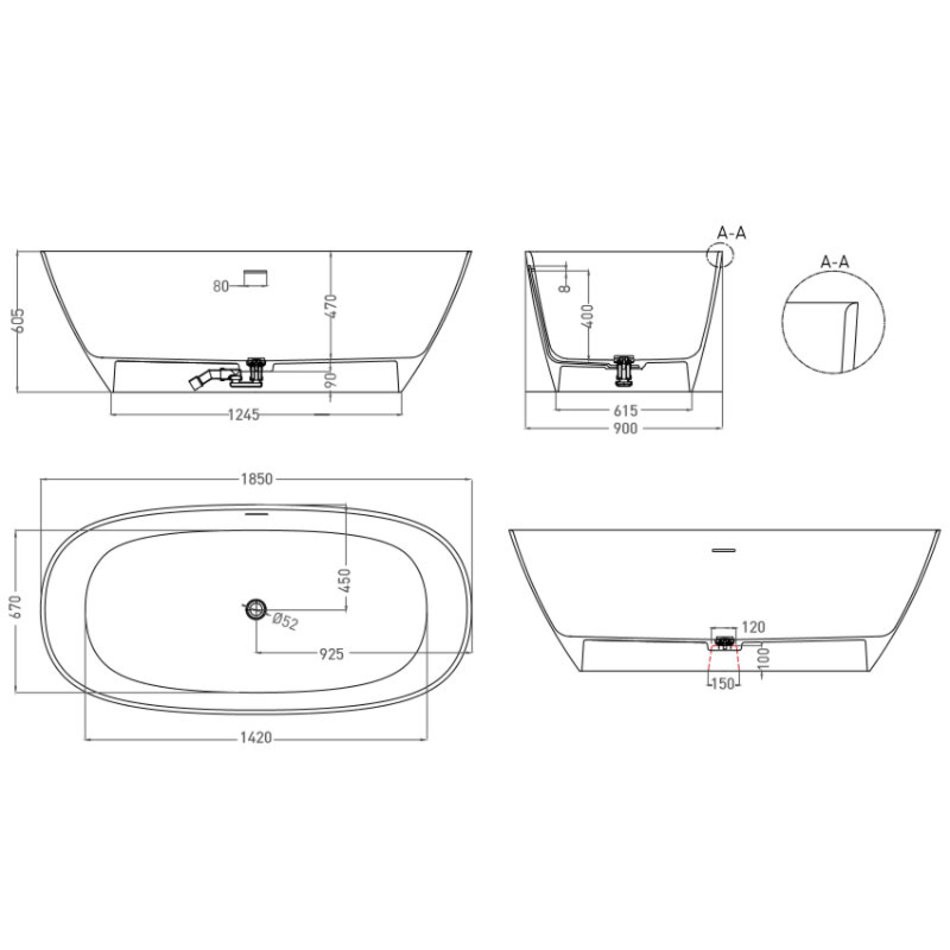 Ванна Salini Sofia 102529MRF, 185 х 90 см, из искусственного камня S-Sense, белый матовый, покраска по RAL полностью