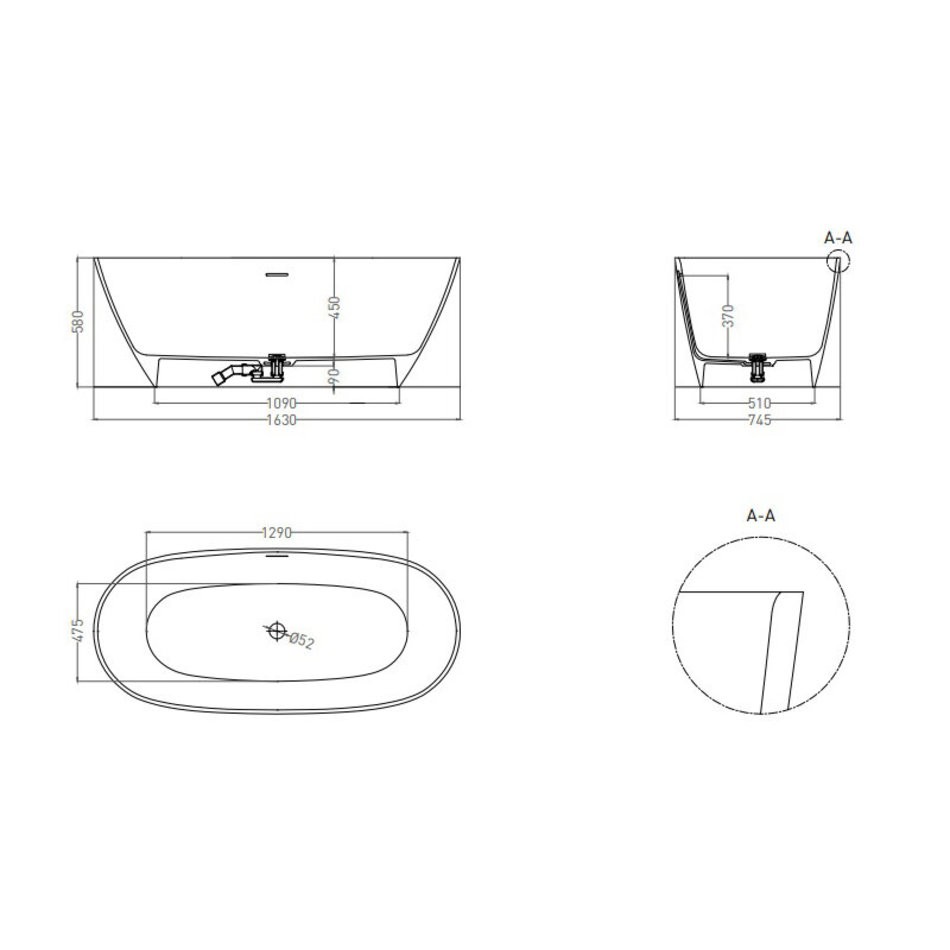 Ванна Salini Sofia 165 х 75 см, из искусственного камня S-Stone, белый матовый, покраска по RAL полностью, 102521MRF