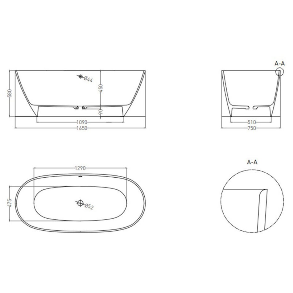 Ванна Salini Sofia Light 165 х 75 см, из искусственного камня S-Sense, белый глянцевый, внешний перелив, по RAL полностью, 103711GRF