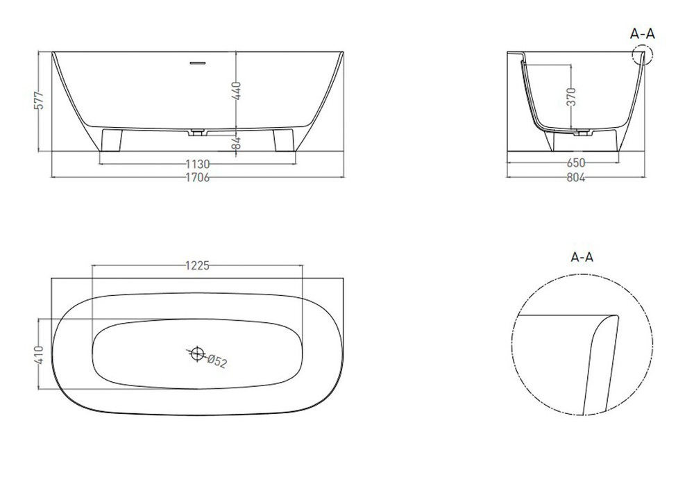 Ванна Salini Sofia Wall 170 х 80 х 58 см, из искусственного камня S-Sense, белый глянцевый, 102512G