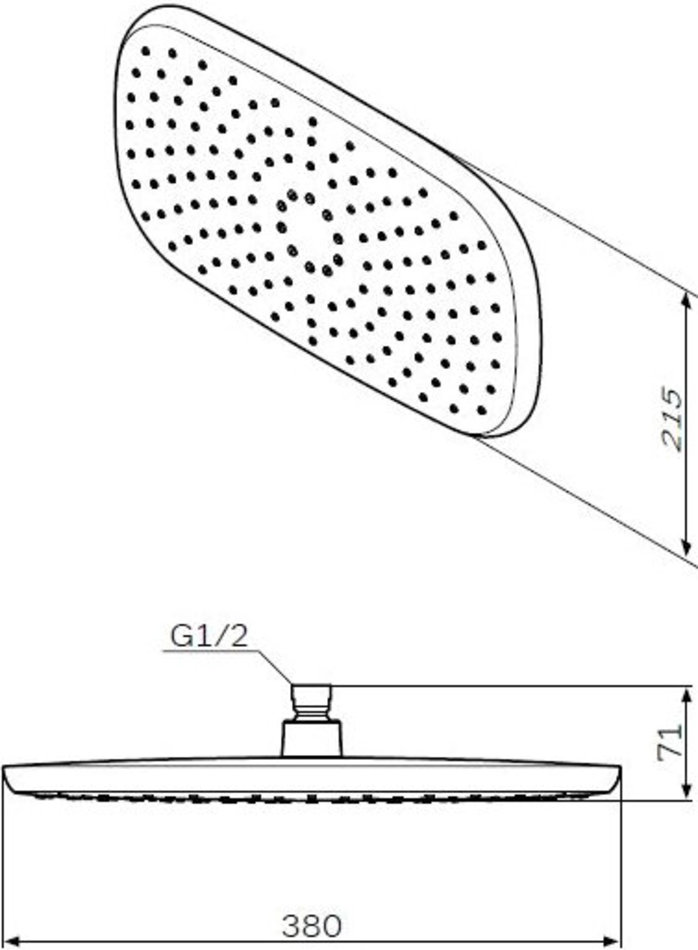 Верхний душ: размер 380*215 мм, 1 режим верхнего душа, функция Rub&Clean для легкой очистки душевых форсунок, шаровой шарнир позволяет регулировать угол наклона.