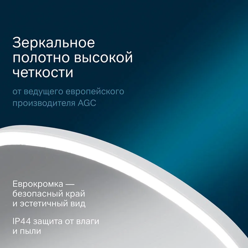 Зеркало изготовлено из зеркального полотна от ведущего европейского производителя зеркал AGC. Изделие имеет высокую степень защиты от попадания капель воды, брызг.