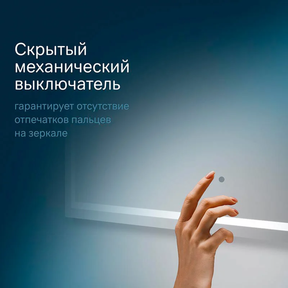 Скрытый механический выключатель сохраняет эстетическую целостность дизайна зеркала, а также гарантирует отсутствие отпечатков пальцев на зеркальном полотне;