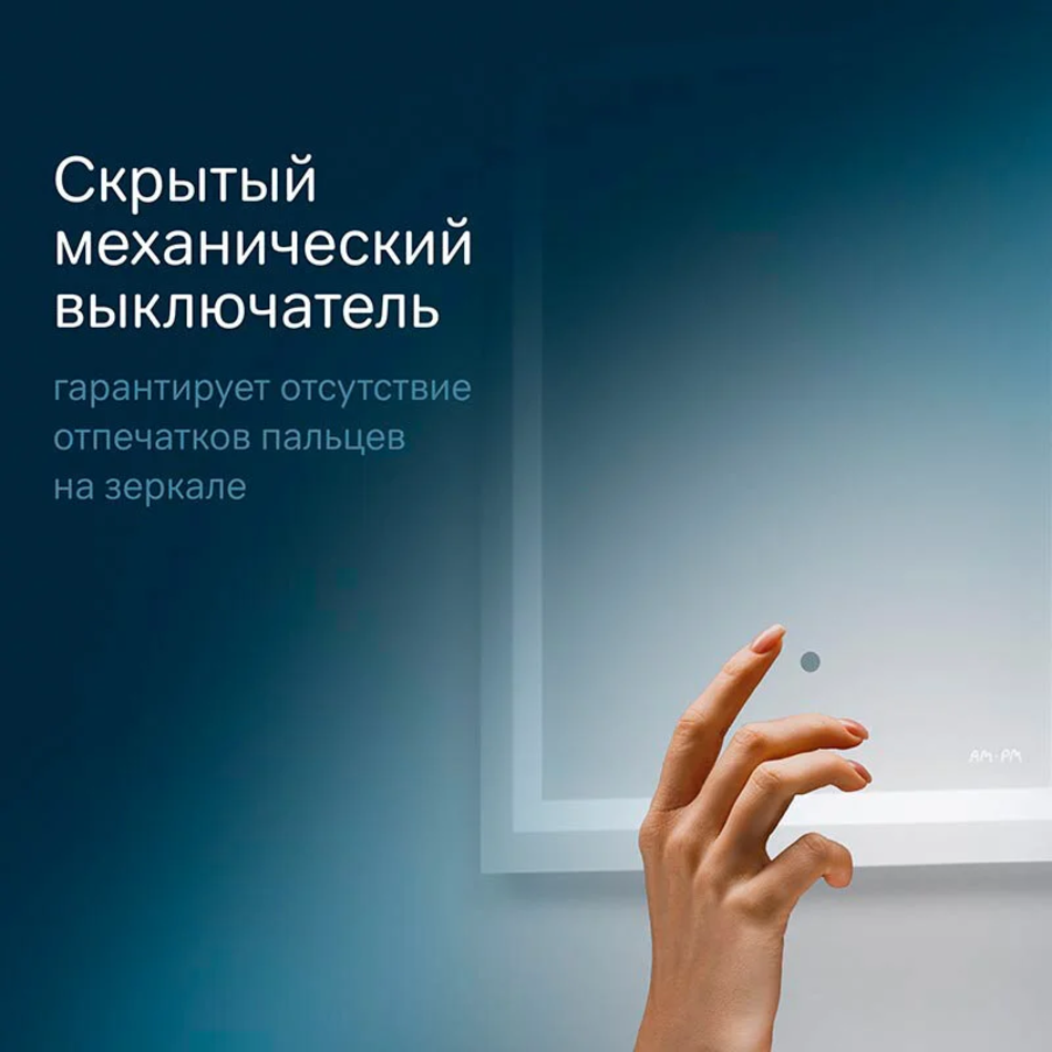 Скрытый механический выключатель сохраняет эстетическую целостность дизайна зеркала, а также гарантирует отсутствие отпечатков пальцев на зеркальном полотне;