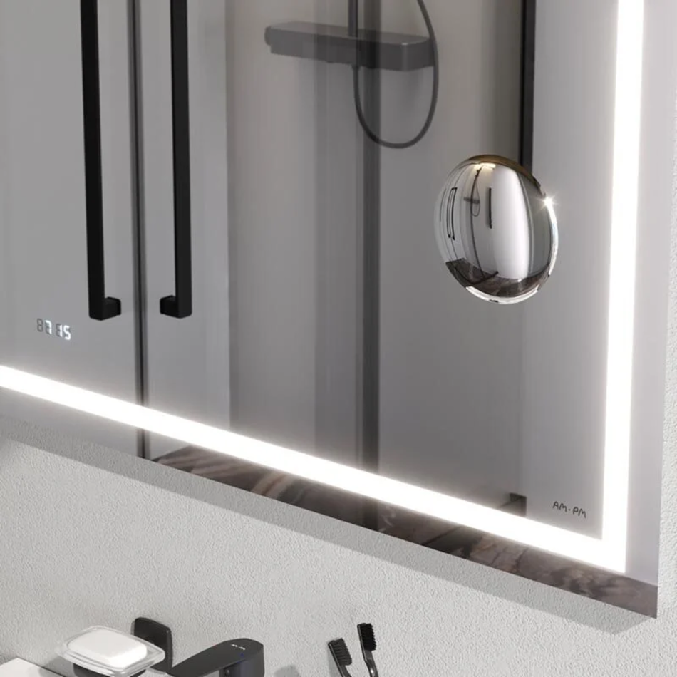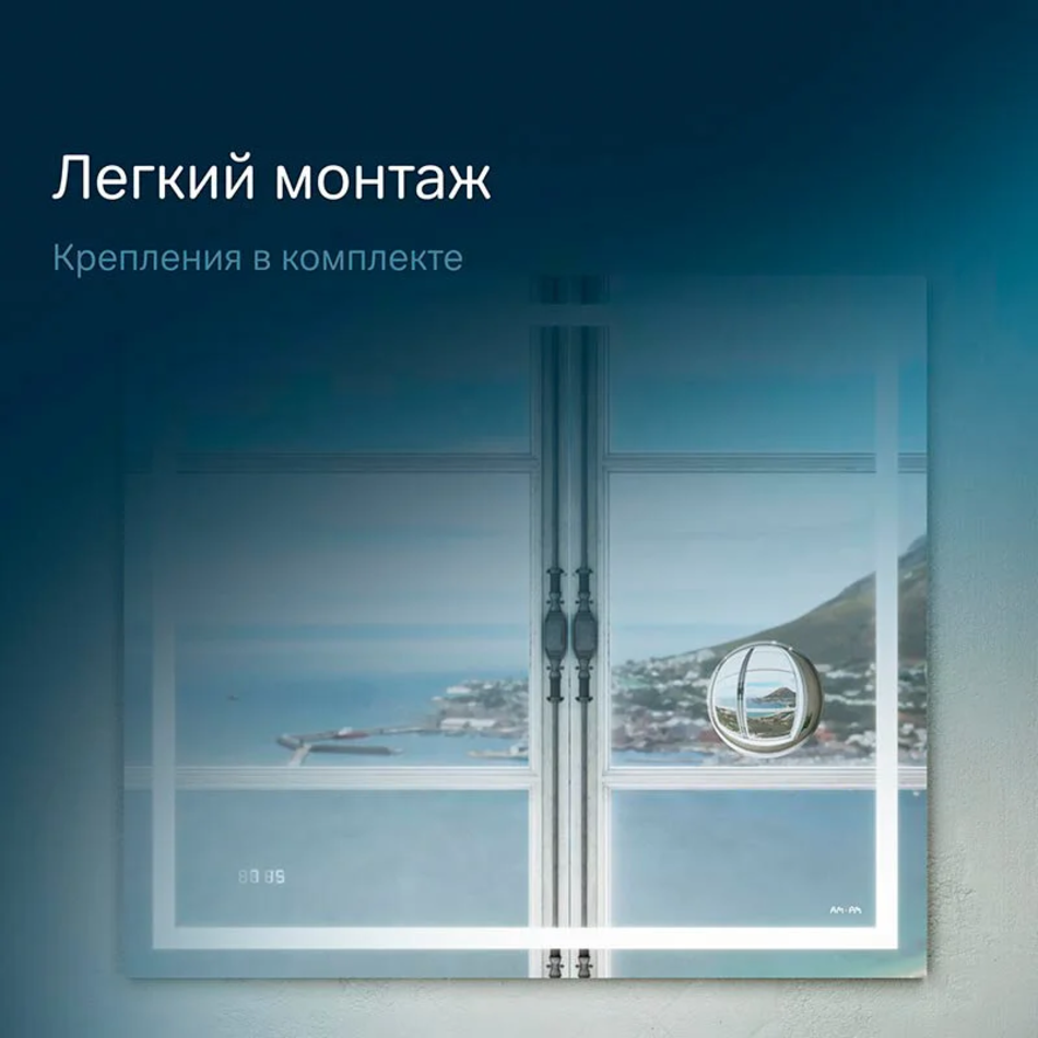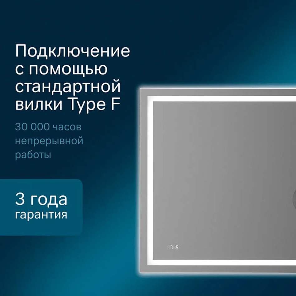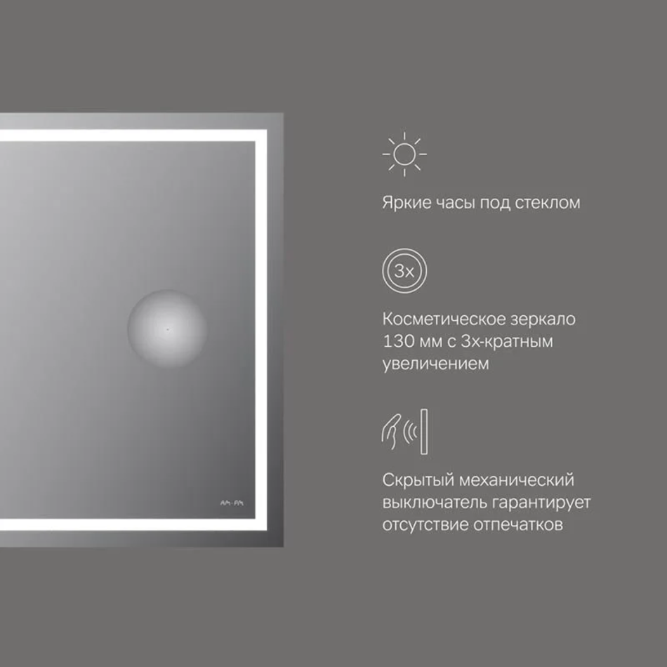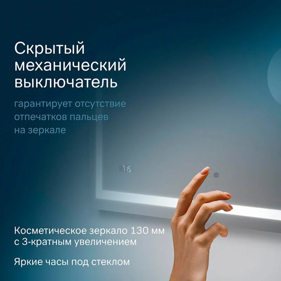 Скрытый механический выключатель сохраняет эстетическую целостность дизайна зеркала, а также гарантирует отсутствие отпечатков пальцев на зеркальном полотне;