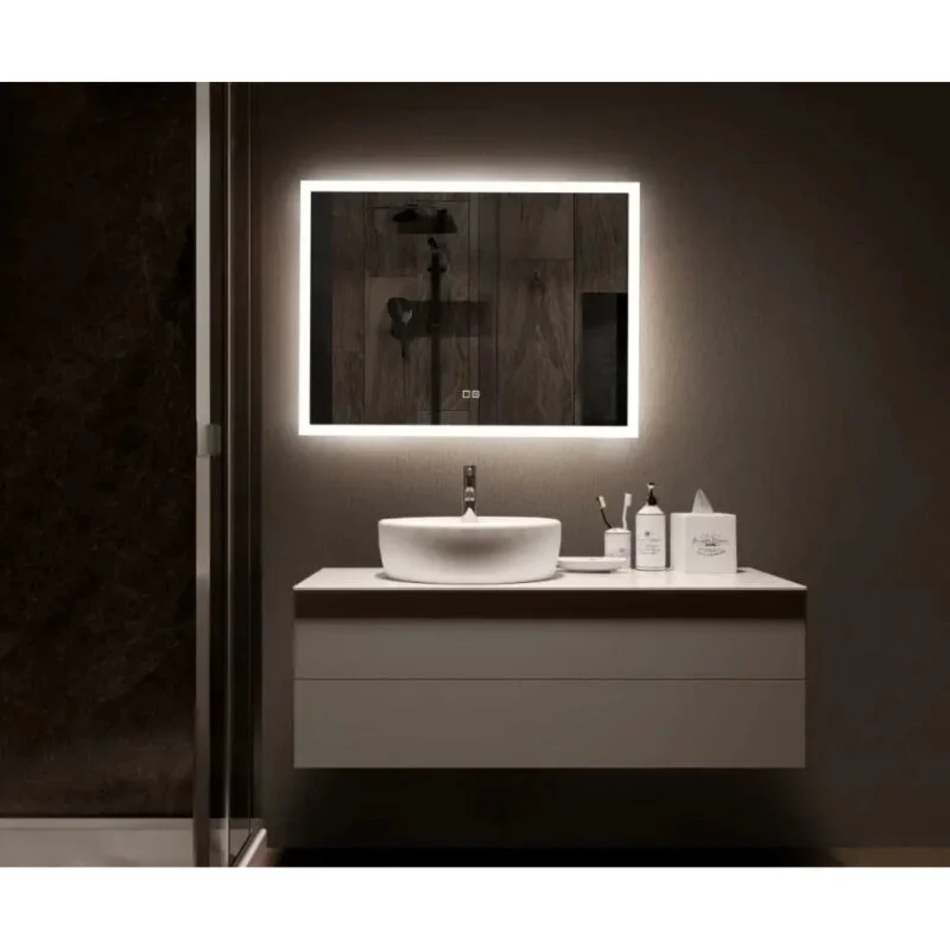 В каждой линии этого минималистичного прямоугольного зеркала ощущаются стиль и функциональность. Лаконичный рисунок по периметру с LED-подсветкой создаёт иллюзию широкой, но лёгкой светлой рамы. Благодаря этому зеркало воспринимается как окно, добавляет пространству света и воздуха, сбалансирует тёмный интерьер. При этом оно не перетягивает на себя излишнее внимание, вносит ощущение гармонии и спокойствия. Модель оценят любители просторных, «чистых» интерьеров и красивых, практичных вещей. Широкая полоса подсветки, регулируемая сенсорным выключателем с функцией диммера, отвечает за комфорт при нанесении макияжа. А подогрев исключит запотевание зеркального полотна в ванной.